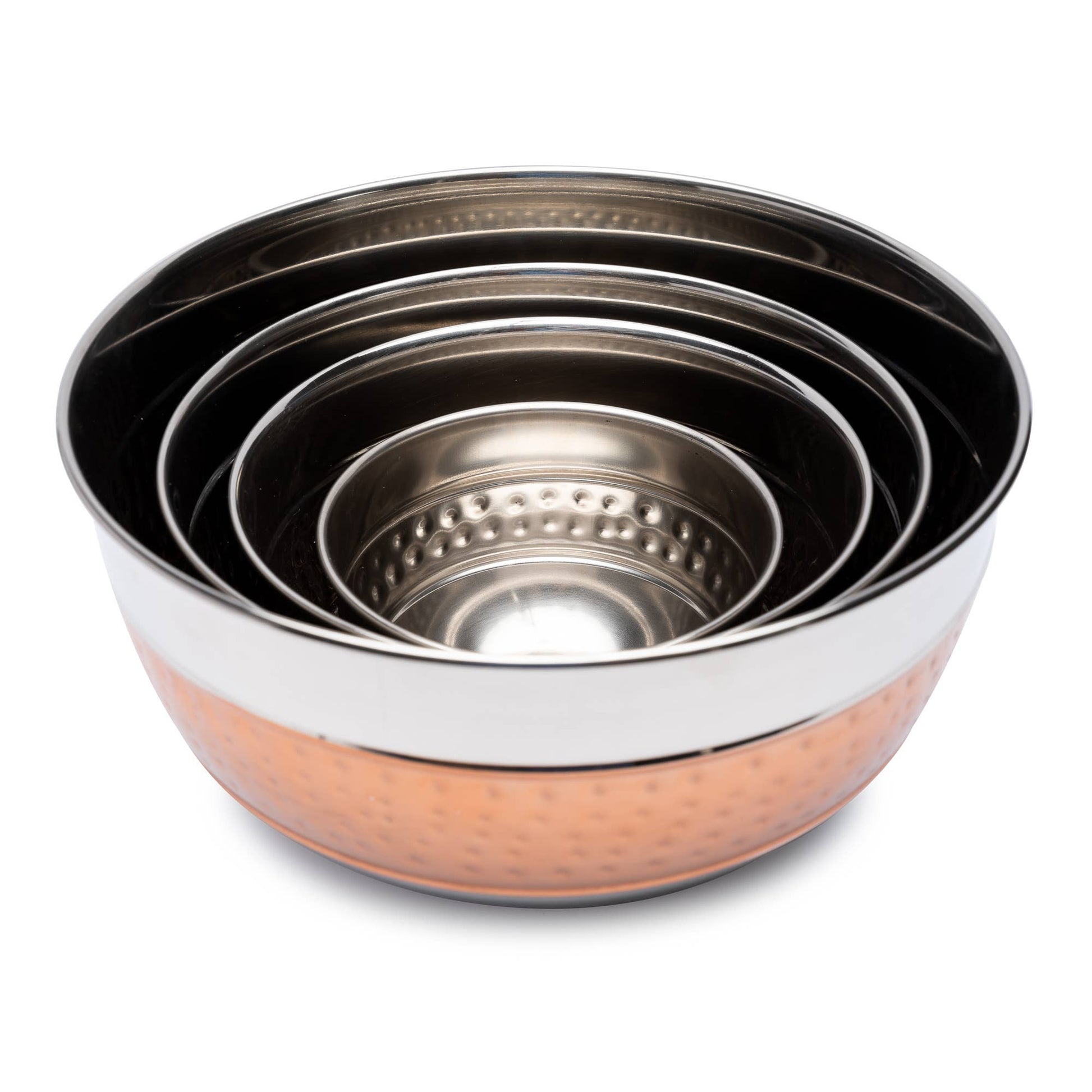 From serving snacks to mixing ingredients, do it all with a touch of modern flair using the Lexi Home hammered stainless steel bowls. Crafted from polished 18/10 stainless steel, each bowl features a striking copper hammered texture band in the middle and a polished mirror finish inside. This set of four nesting bowls is not only a versatile kitchen companion but also makes a fabulous wedding or housewarming gift. Add a touch of elegance to your kitchen with these stunning and functional bowls!