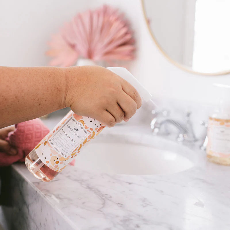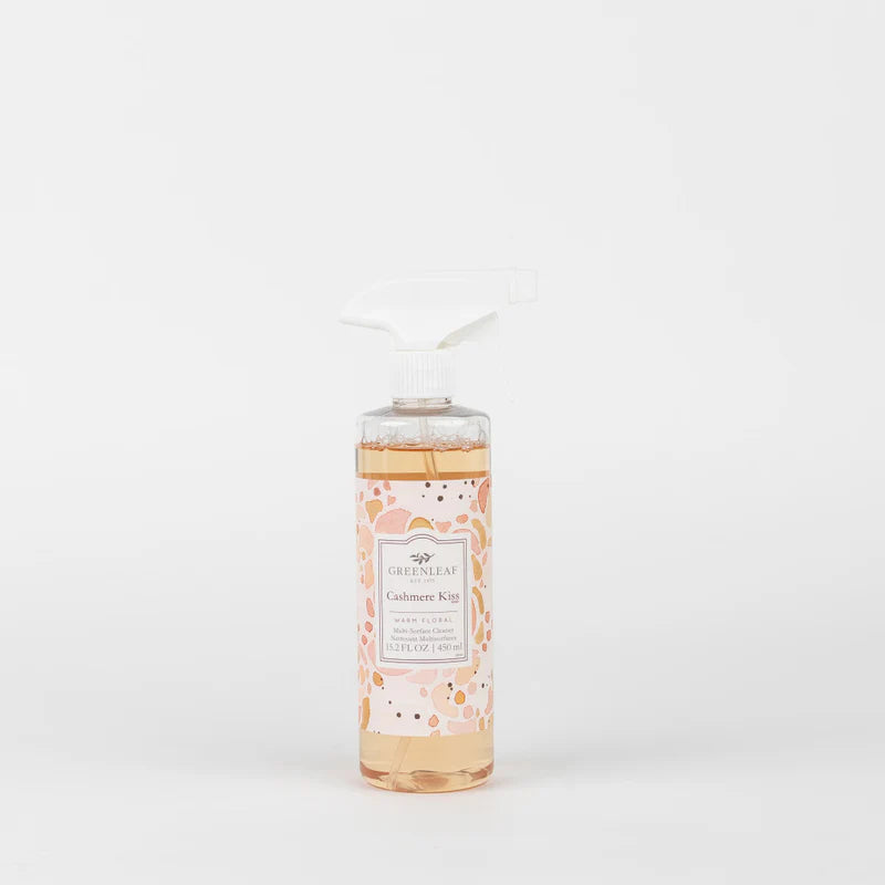 Make cleaning something to look forward to! Greenleaf Multi-Surface Cleaner can be used to eliminate dirt and grime from most non-porous surfaces. Now that cleaning smells this good, we know you'll be eager to wipe down those counters! Cashmere Kiss is bound by passion and romance. Stirring citrus accords tenderly fold into fields of jasmine and rose. A rich finish of vanilla, patchouli, and musk seal the fragrance with a kiss of elegance. Wet the surface with the spray and wipe clean. For stubborn stains, let stand for a minute before wiping. Safe for use on most non-porous surfaces.