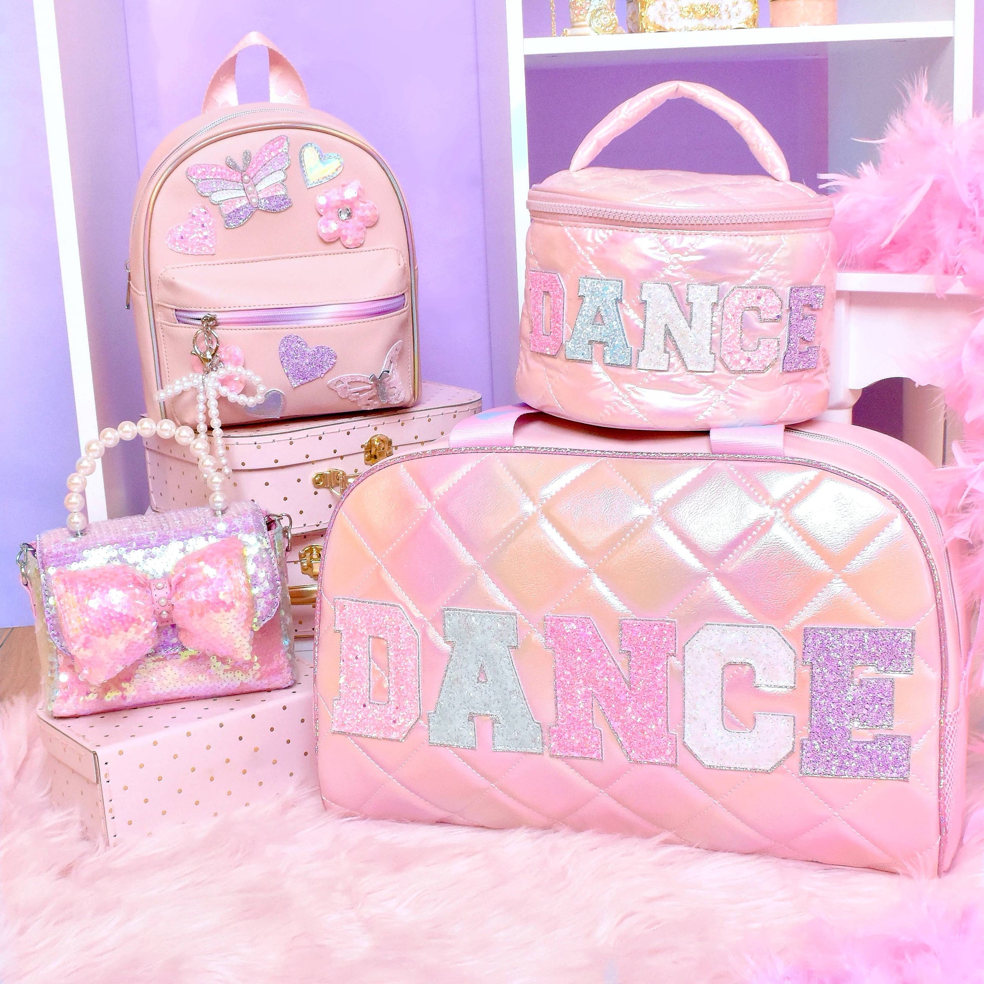 Your mini will steal the spotlight with this pink metallic quilted round glam bag! Detailed with glitter 'DANCE' varsity letter patches. Your tiny dancer can keep their beauty essentials compact and near on and off stage!