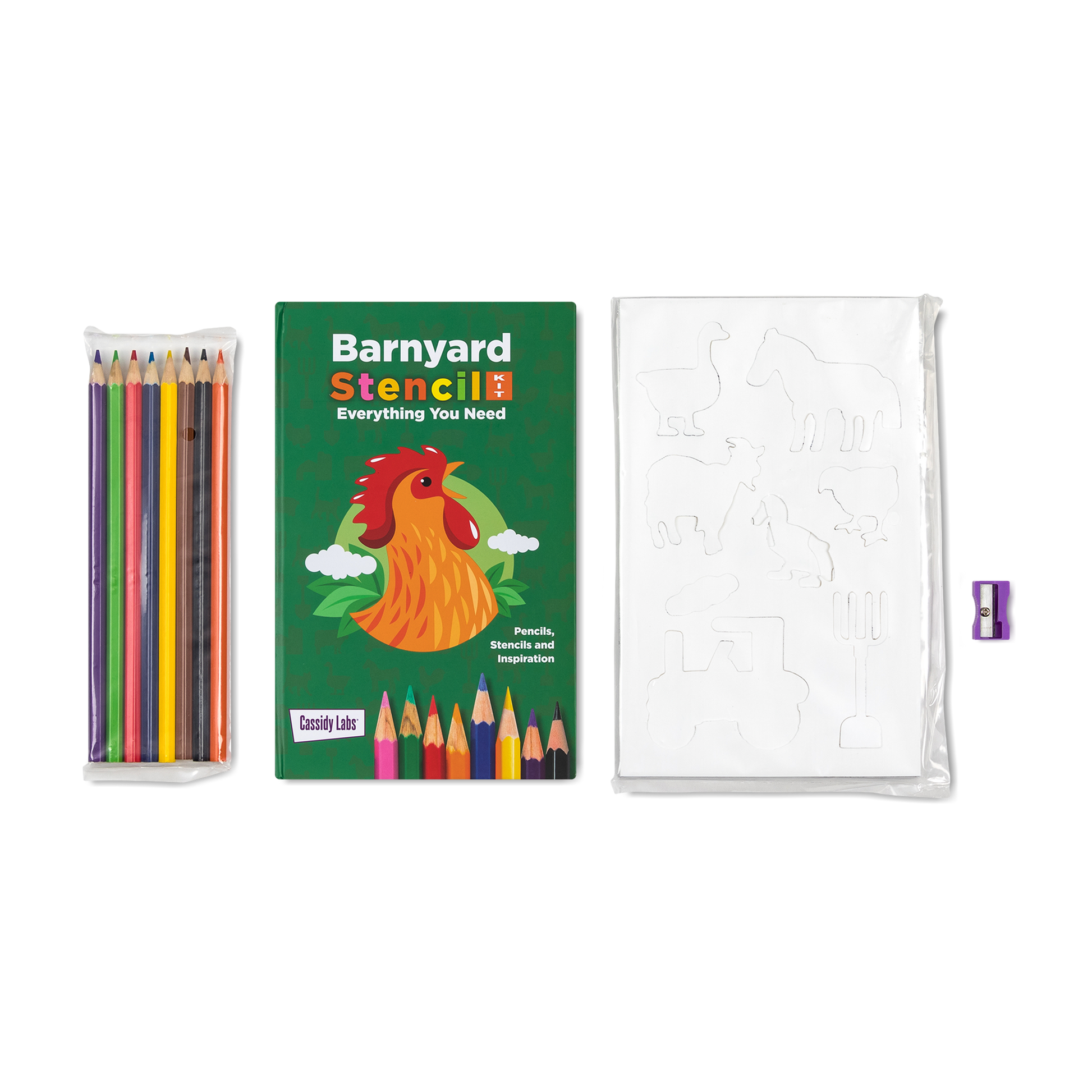 * 67 Stencils * 40 Pages of Inspiration and Drawing Space * 8 Colored Pencils * 1 Pencil Sharpener