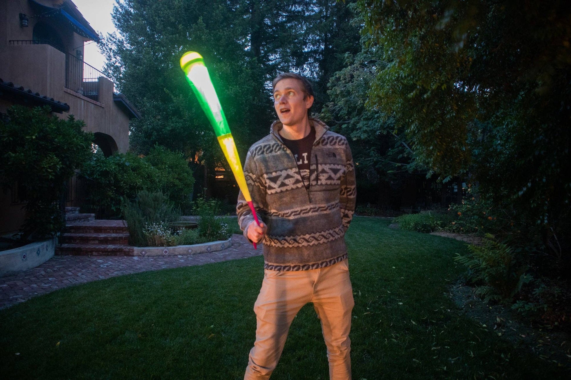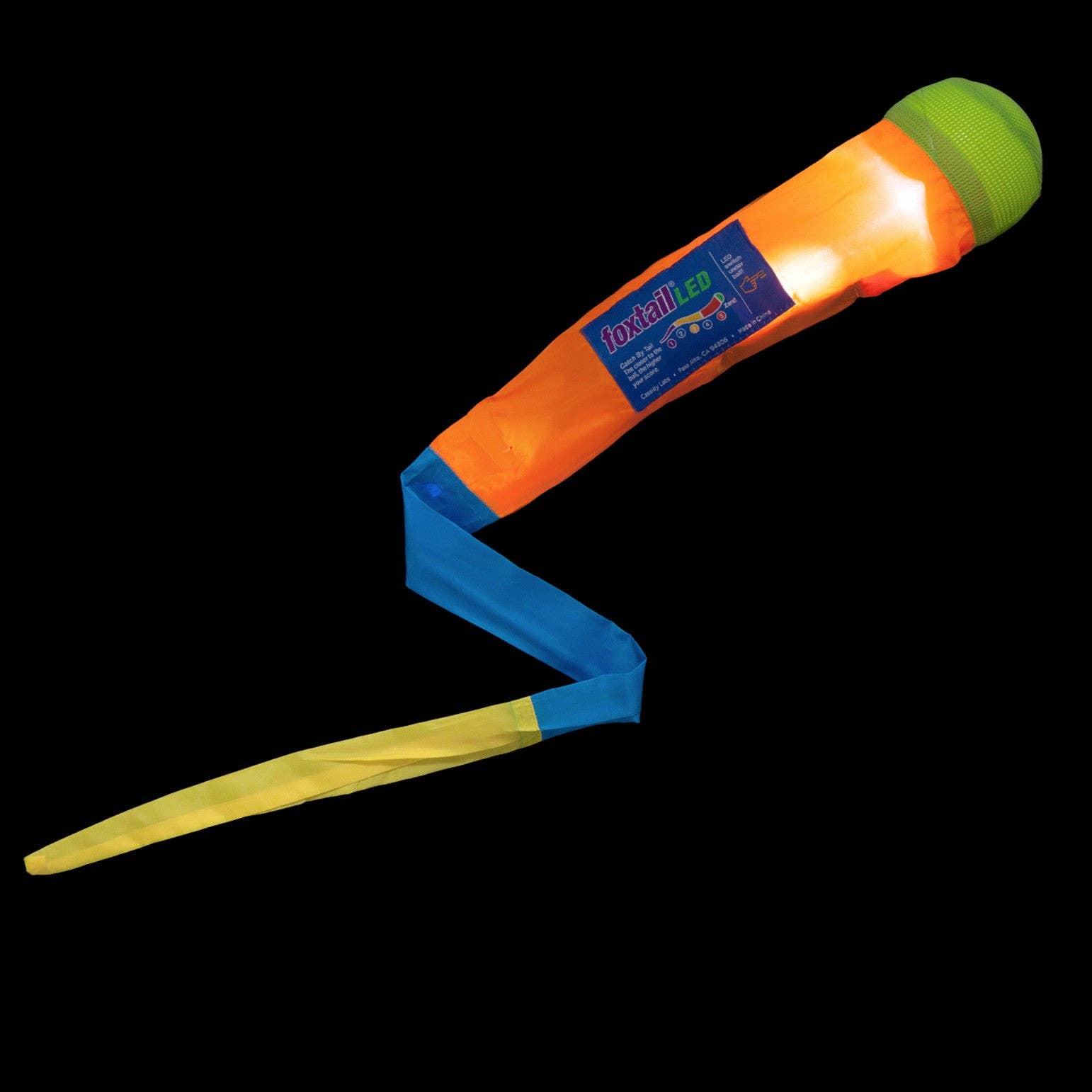 Light up the night sky with the newest member of the Foxtail family! This Foxtail comes with 2 LED lights embedded in its specially formulated Light-Transmitting foam ball. Two LED bulbs shoot a beam of light down the tail, and another beam of light directly into the ball, creating a beautiful shooting-star effect when thrown.