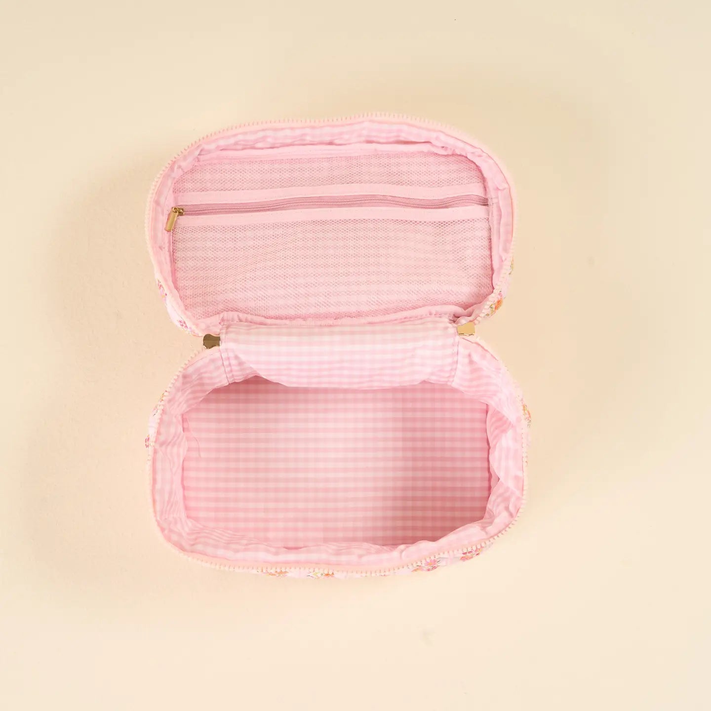 Simplify your routine with the Glam & Go Quilted Cosmetic Bag. Crafted from soft, quilted fabric with a sturdy handle, this bag features an all-around gold double zipper for easy access. Inside, the signature darling wipeable interior lining keeps everything neat and organized. It's perfectly sized to carry your must-haves, whether you're traveling, running errands, or just need a stylish way to keep your essentials in place.
