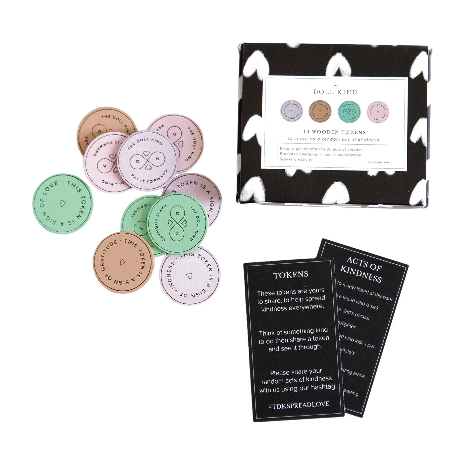 - 10 wooden tokens (MDF) with non-toxic paint in lavender (kindness token), pink (love token), teal (hope token), tan (gratitude token), peach (friendship token).