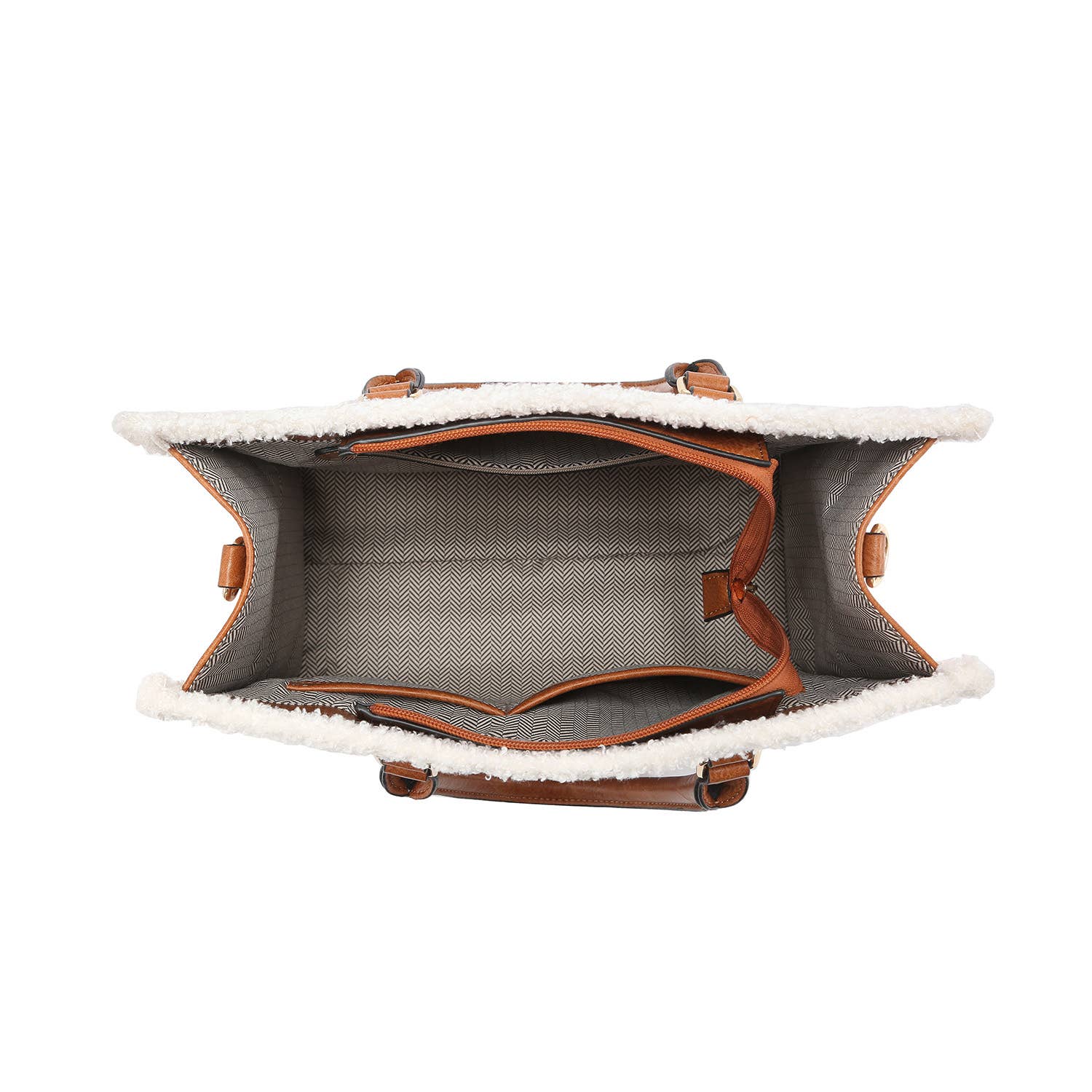 Bevin Sherpa Trim Tote -Type: Sherpa trim structured tote -Closure: Top zipper closure -Strap: Adjustable/removable crossbody strap -Interior: Inner zip and slip pockets -Material: Vegan leather Dimensions: -Length: 13.5 inches -Width: 5.25 inches -Height: 11 inches *SALE* on selected colors only The M2181 Bevin Sherpa Trim Tote combines style and functionality in a structured design. This tote features sherpa trim, adding a cozy and stylish accent to its structured silhouette. The top zipper closure ensures the security of your belongings, while the adjustable/removable crossbody strap provides versatility in carrying options.