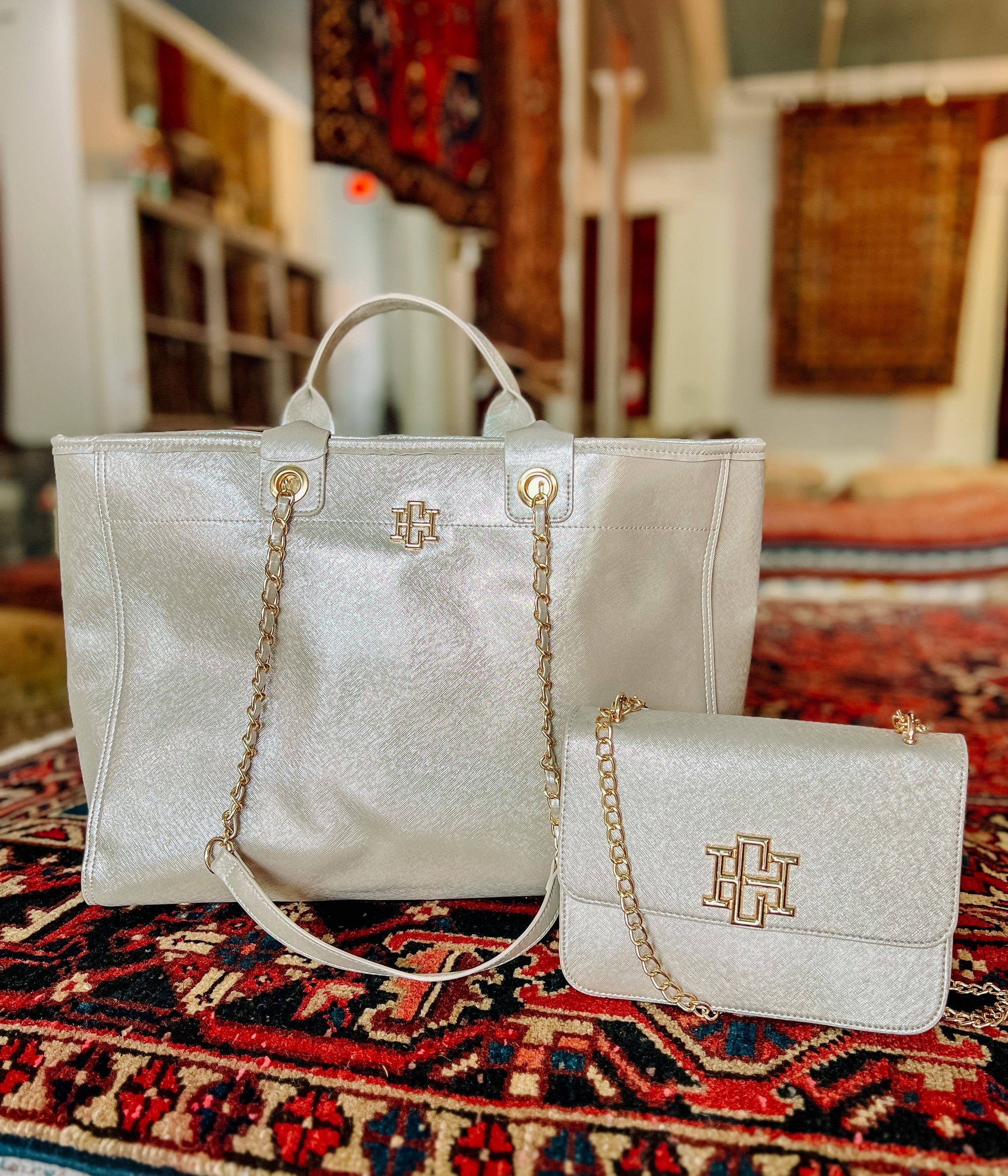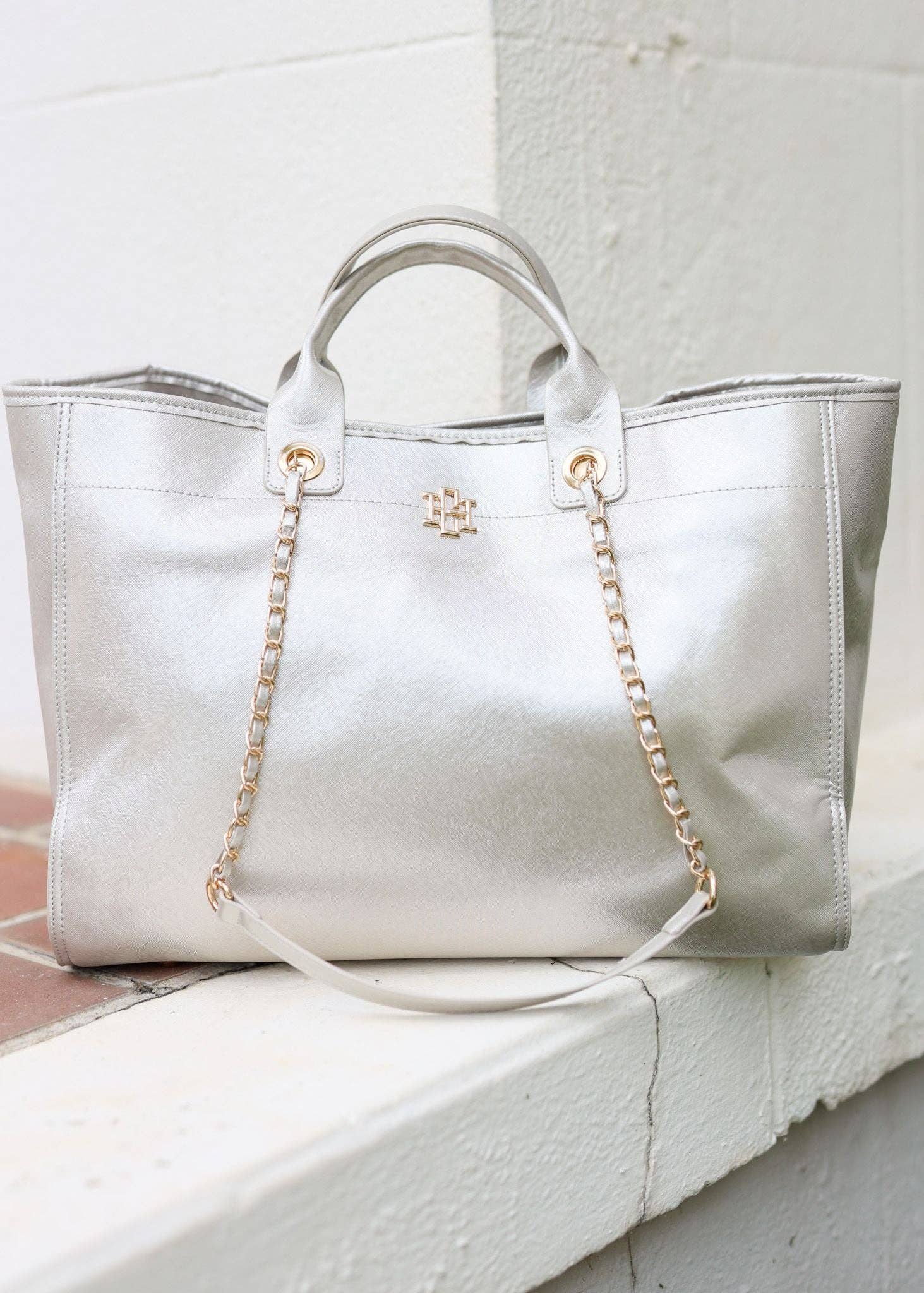 This oversized tote is the best go-to handbag! It has two short top handles as well as two elongated braided handles to carry on your shoulder. The Caroline Hill logo is centered at the top of this bag on one side. It has a magnetic closure leading to the roomy interior of the bag. It has one zippered pocket and two open pockets inside. There are also feet on the bottom of the bag for added protection. It's the perfect size for travel, carrying a laptop, or for everyday fashion.