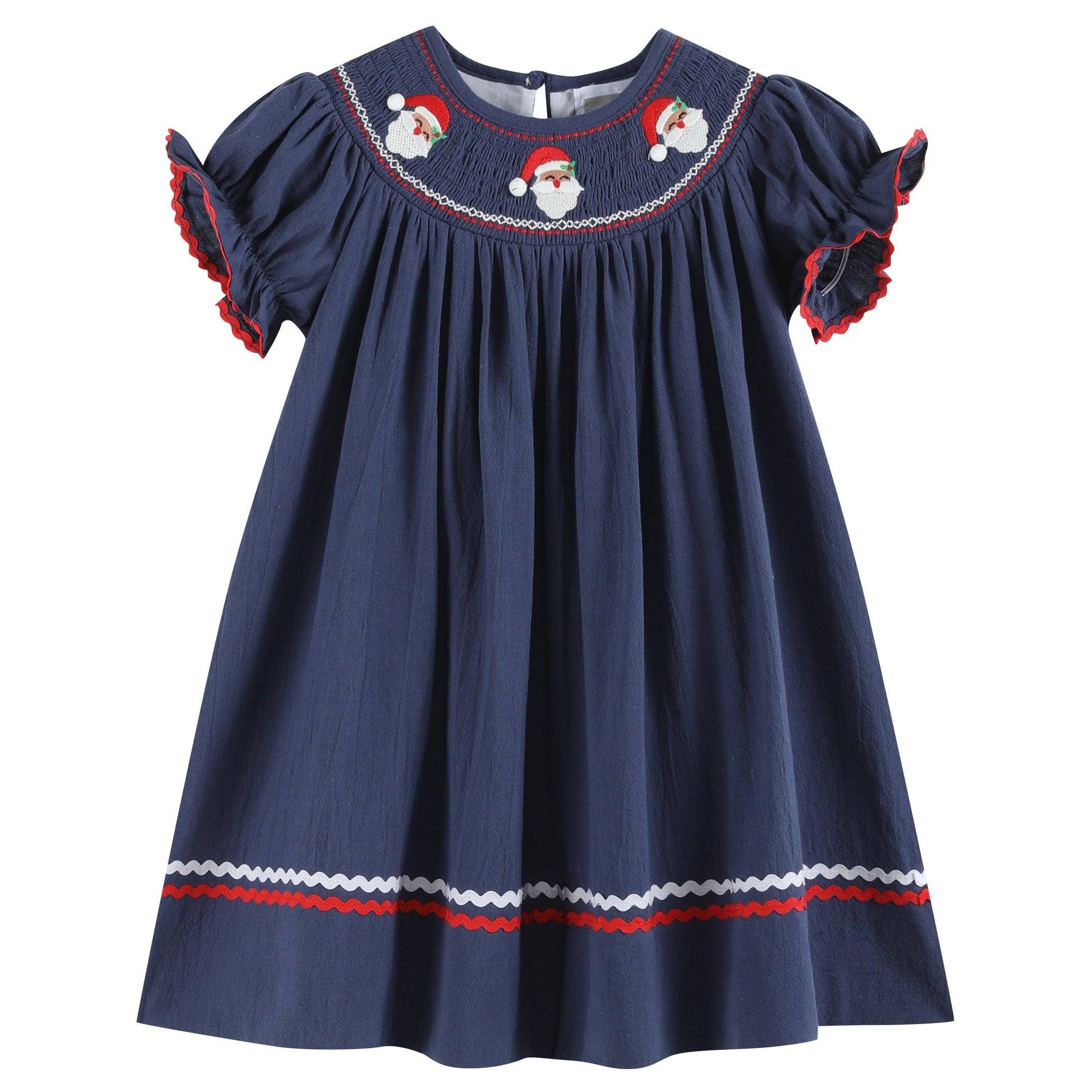 Spread holiday cheer with our Navy Blue Santa Smocked Bishop Dress! Adorned with delightful smocking along the neckline featuring embroidered Santa, this dress is the perfect blend of winter charm and Christmas cuteness. Made in a pretty navy cotton, it's an adorable choice for festive occasions and merry celebrations.