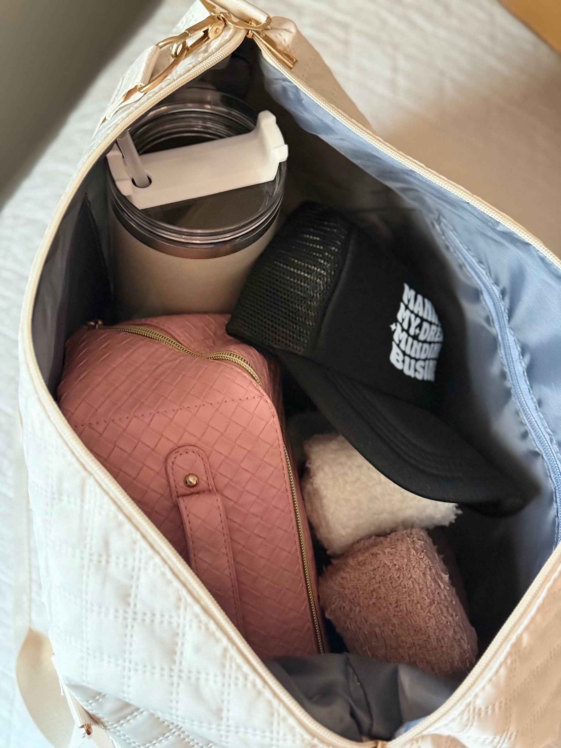 Effortlessly stylish and functional, our Quilted Overnight Duffle is the perfect travel companion. Keep all your essentials organized with the wet/dry zipper compartment and top zipper closure. Our favorite feature is the trolly sleeve (slides right on the handle of your rolling suitcase!) with cute gold zipper pocket for easy access to credit cards or IDs at the airport. This durable water-resistant duffle makes traveling a breeze. Available in black or off-white with gold accents. Slightly smaller than our best selling quilted weekender, this is the perfect choice for overnight stays or airport travel days! * Trolly sleeve with zipper pocket for easy access to credit cards or ID