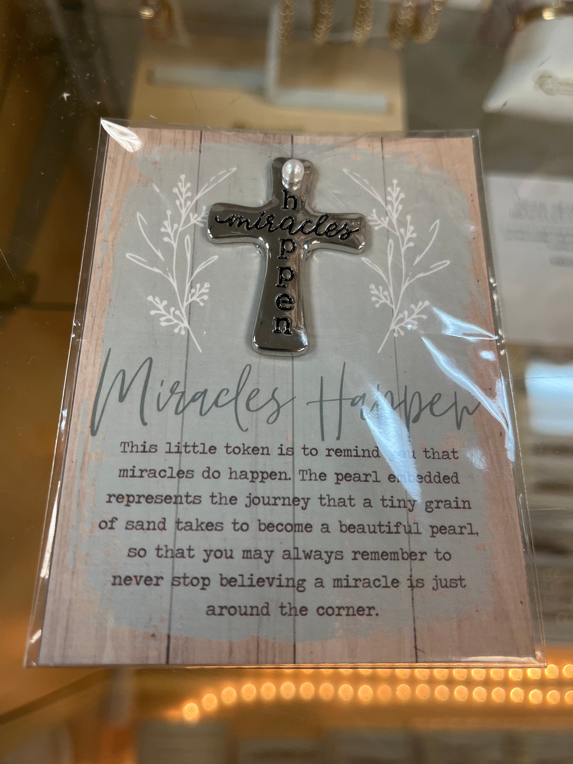 This little token is to remind you that miracles do happen. The pearl embedded represents the journey that tiny grain of sand takes to become a beautiful pearl so that you may always remember to never stop believing a miracle is just around the corner.